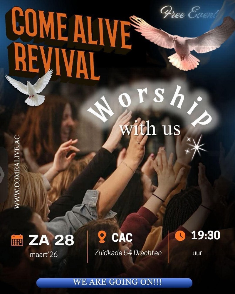 Al deze avonden zullen beginnen om 19.30 uur in het Come Alive Center, aan de zuidkade 54 in Drachten. En zullen zijn op 9-10-11-12-13 maart, let op! De diensten gaan door op 16-17-18-19-20 maart
