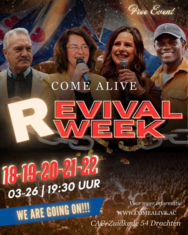 Al deze avonden zullen beginnen om 19.30 uur in het Come Alive Center, aan de zuidkade 54 in Drachten. En zullen zijn op 9-10-11-12-13 maart, let op! De diensten gaan door op 16-17-18-19-20 maart